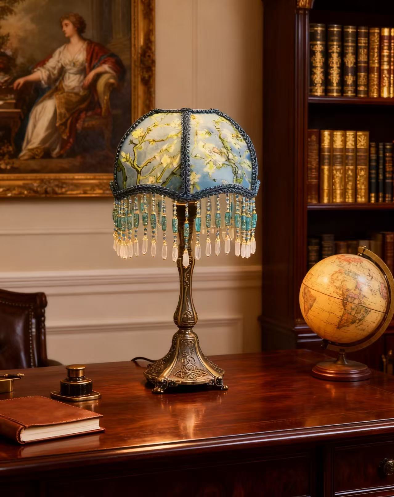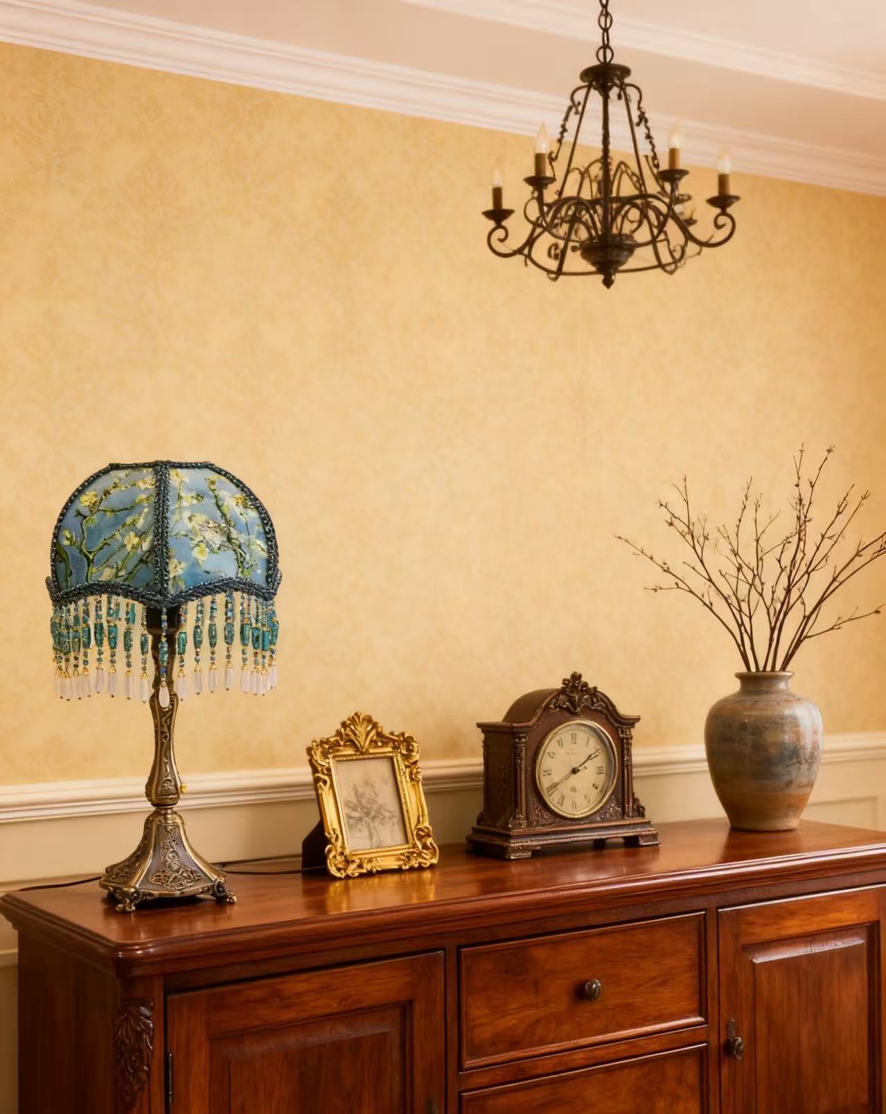 Der Lampenschirm ist mit einem Retro-Aprikosenblütenmuster gestaltet, das natürlich retro und schön ist. Es verwendet handgefertigte Retro-Quasten, die retro und warm sind. Das einzigartige Perlenmuster ist rein handgefertigt. Die Basis besteht aus geprägtem Retro-Bronzematerial, das sicher und langlebig ist. Es ist eine sehr einzigartige Einweihungsgeschenklampe.