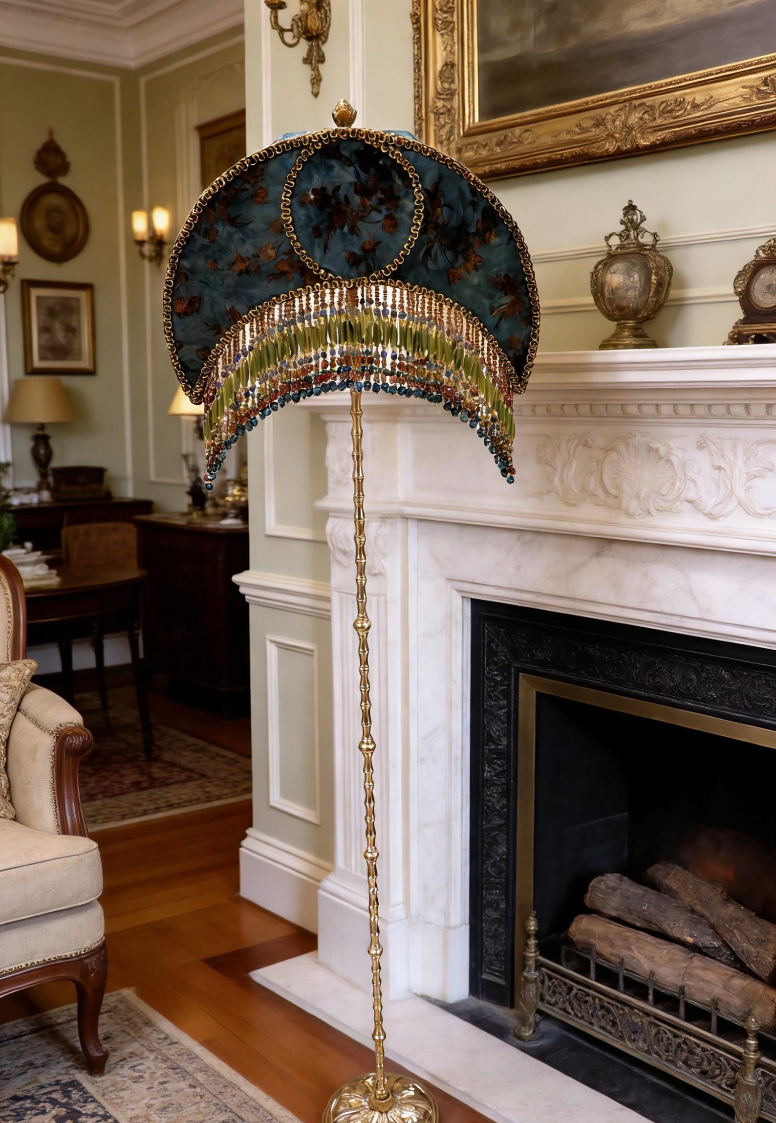 Victorian-style floral velvet moon floor lamp, with a gold brass base and gradient glass bead tassels, an Art Deco style piece that elegantly complements fireplaces, living rooms, and bedrooms.