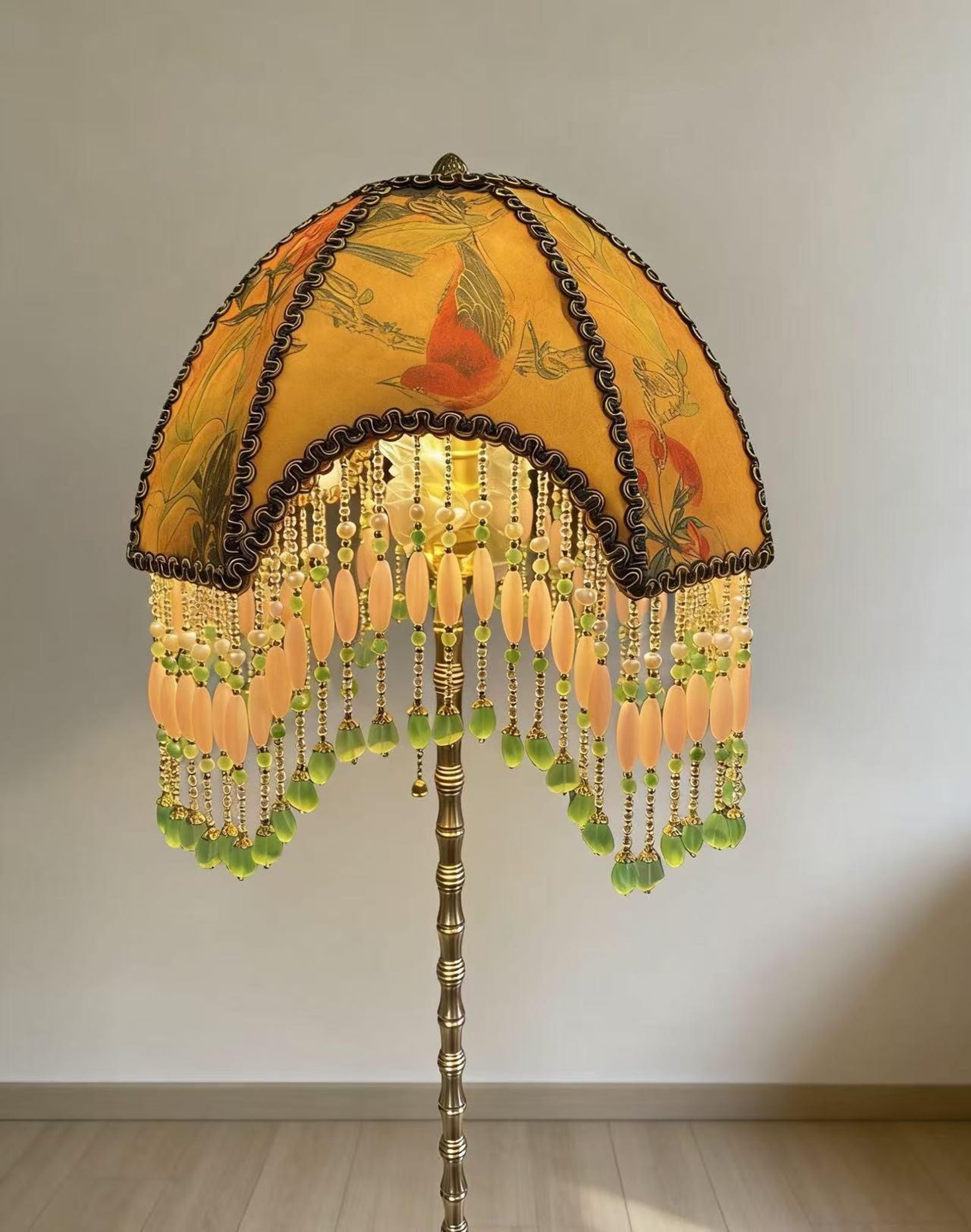 · Artistic Shade: The domed shade is crafted from textured fabric and embellished with vibrant bird and floral motifs, evoking the feel of natural art. Delicate brass accents frame the shade, while cascading beaded tassels (made from glass beads, pearls, and natural shells) add a touch of movement and bohemian flair—each tassel perfectly catches the light, creating a captivating display of color and shimmer.
