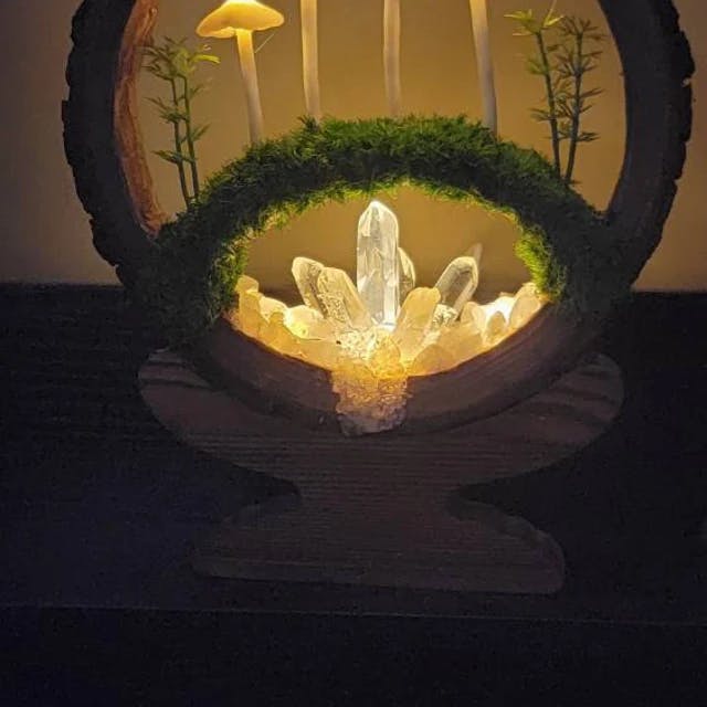 The overall material is taken from natural logs, retaining the most original bark, which is the closest to nature. There are four cute and playful mushrooms on the lamp body, which are all made by artists with clay, restoring the most original appearance of mushrooms, covering The moss of the mushrooms is also taken from nature and dried on the bedding. The bottom is a crystal cluster composed of six natural crystals, and the side is covered with crystal stones. Using LED light source, safe, reliable and durable, all materials are natural environmental protection materials, you can use it with confidence