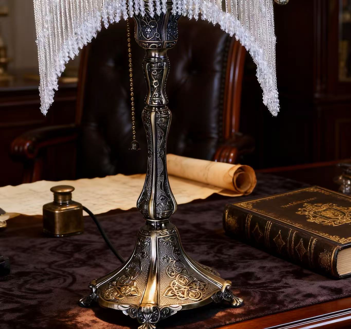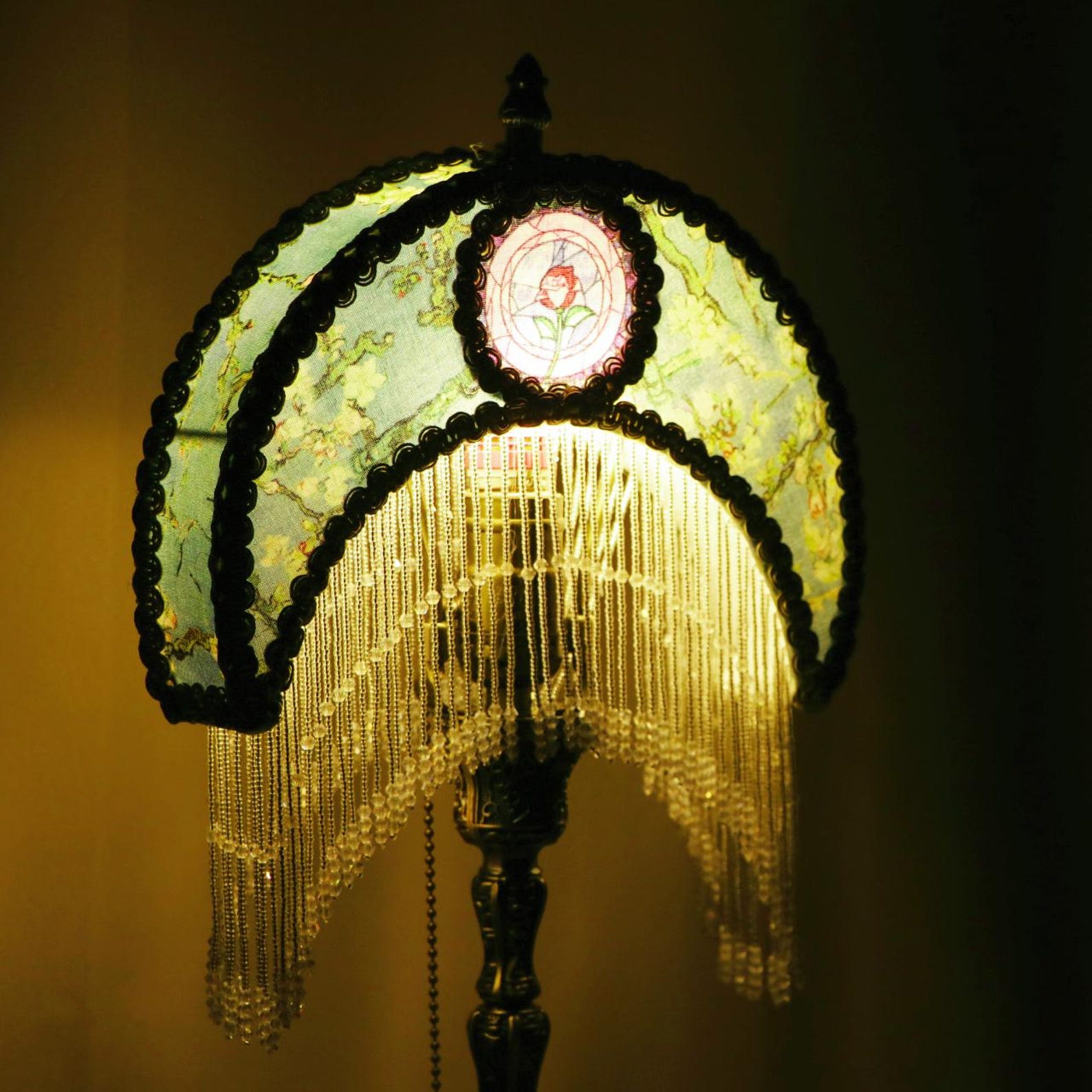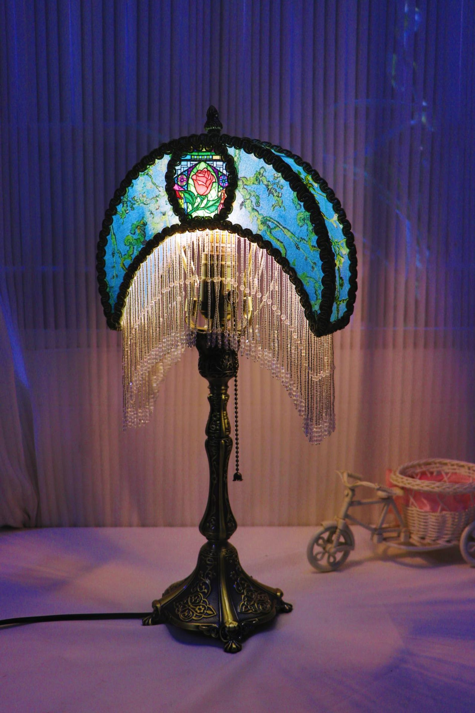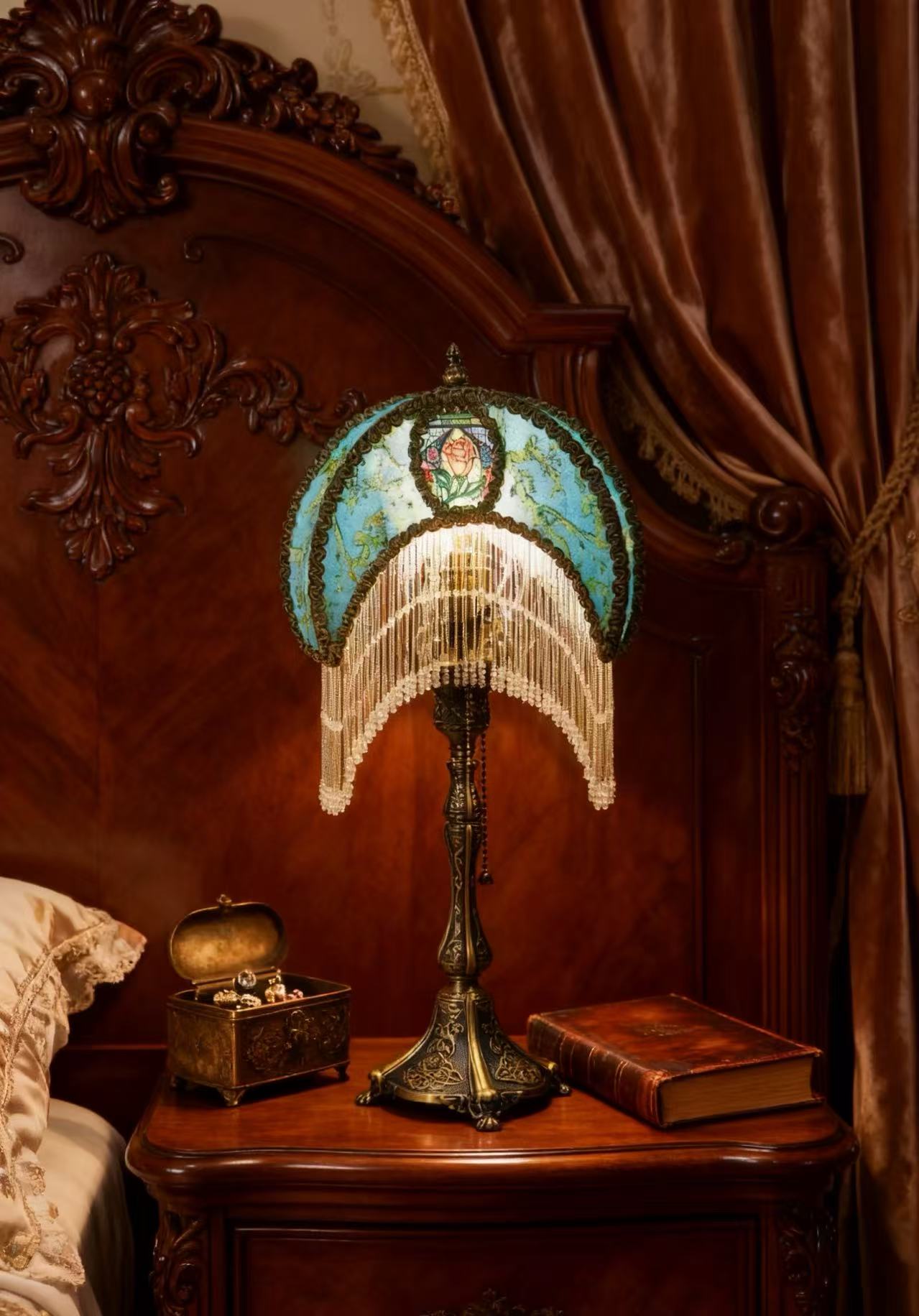 Handmade DIY original retro table lamp, retro moon shape, the rose in the center of the lampshade means the rose in the palm of the hand, full of love, tassels pouring down like a waterfall, noble and mysterious at first sight, showing the beauty of nobility, the combination of retro and nobility, composite Satin fabric lampshade, bronze lamp base, retro and reliable, the lamp screen composed of super crystal beads, noble and elegant. When the switch is turned on, the emerald green moon-shaped lampshade emits warm light, and the warm light complements the green light, like a dazzling gemstone exuding mysterious light. charm. This is unique.