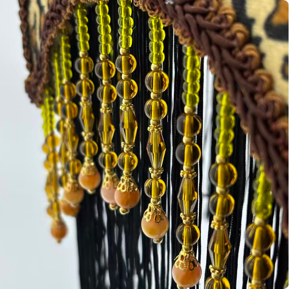Handcrafted Crystal Bead TasselsThe shade is adorned with hand-strung high-clarity crystal beads and black tassels. Each bead is meticulously selected and strung, creating a delicate, swaying effect that catches the light and adds a touch of bohemian elegance to your decor. As a handcrafted item, minor variations in bead placement and tassel length are inherent and add to its unique character.